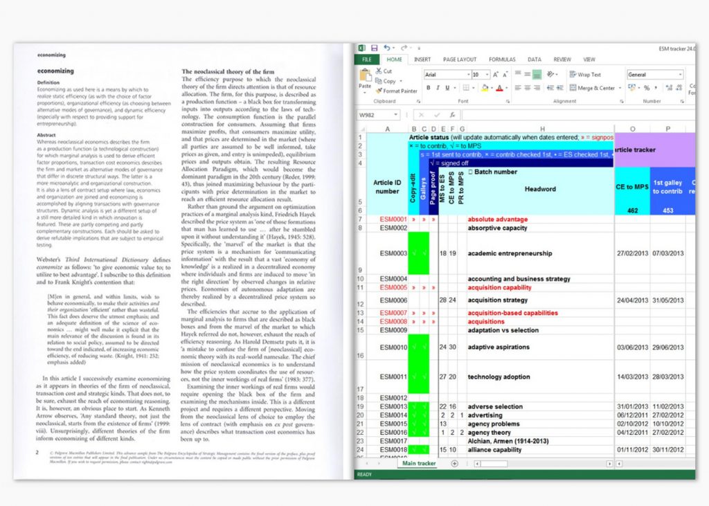 Having worked on the Palgrave Dictionary of Economics, Bourchier was engaged to copy-edit and proof-read this flagship Palgrave reference work. With hundreds of individually commissioned entries and signpost articles, the Encyclopaedia required meticulous attention to detail. Bourchier created a tracker system enable all parties involved in production to trace each article at the various production stages.